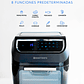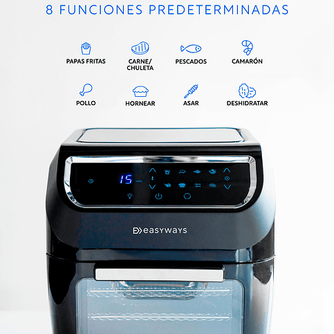 Con su moderno panel digital podrás navegar por sus 8 funciones con tiempos y temperaturas predeterminados que funcionan como guía: Papas fritas, Carne, Pescado, Camarones, Pollo, Horneado, Asar y Deshidratador.